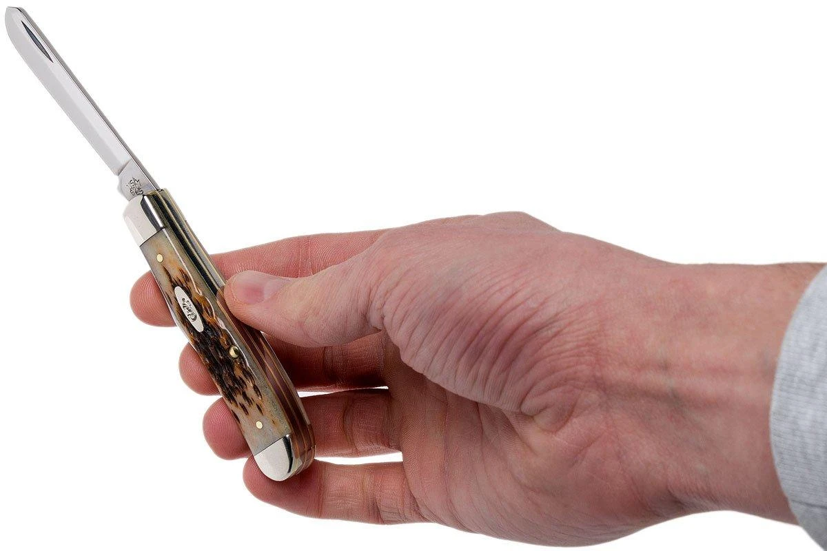 La Case Mini Trapper es una navaja tradicional con la clásica forma de Trapper. Este patrón fue utilizado por primera vez por cazadores y furtivos. Esta versión específica tiene dos hojas: una clásica de punta de clip y una tradicional de punta de lanza. Ambas hojas tienen, a la hora de desollar la caza, su propia finalidad. Cuando se abren, se mantienen en su sitio gracias a un slipjoint que también se ha mejorado con el llamado «halfstop». Esto significa que se detiene justo antes de cerrarse por completo para proteger los dedos.