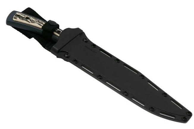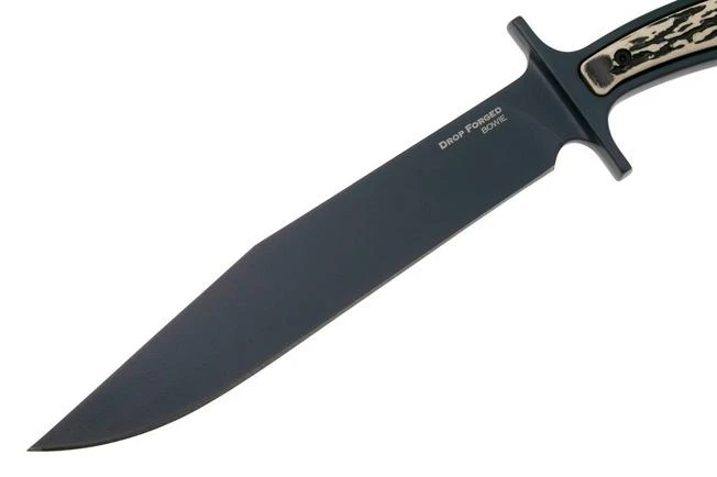 El Cold Steel 36MK Drop Forged Bowie es un notable cuchillo fijo. Lo más destacable es que fue forjado de una sola pieza de acero 52100, incluyendo el mango engrosado. El resultado es un cuchillo sólido y equilibrado que puede soportar un uso intensivo. La hoja tiene un afilado plano, por lo que el cuchillo sigue cortando con precisión, a pesar del grosor de la hoja. Las cachas de cuerno de ciervo de imitación están unidas al mango.