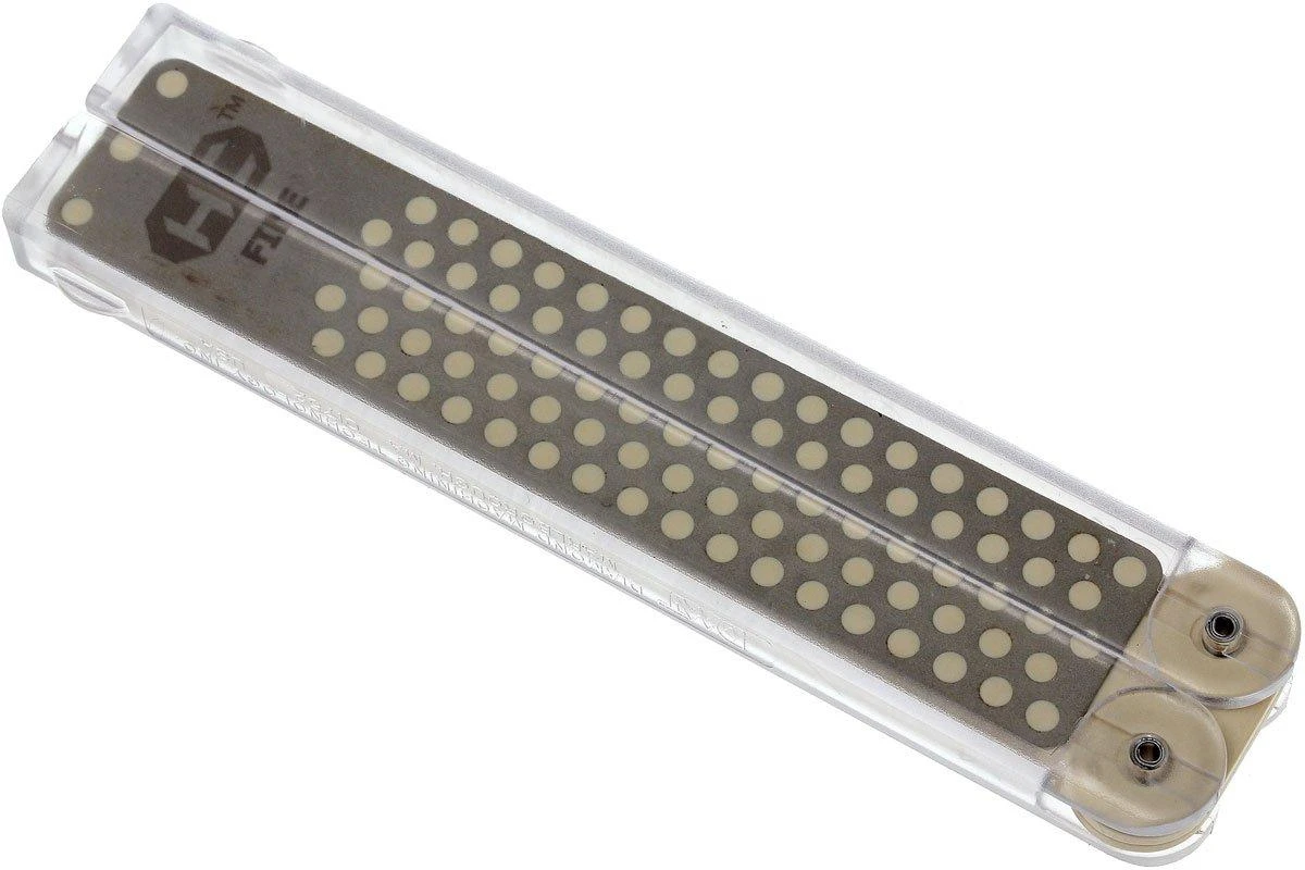 Una piedra Diafold tiene el diseño de un balisong, en el que las asas se doblan sobre la piedra de afilar de diamante. Esto protege la piedra a la perfección. Las piedras pueden utilizarse por ambos lados con diferentes tipos de grano.