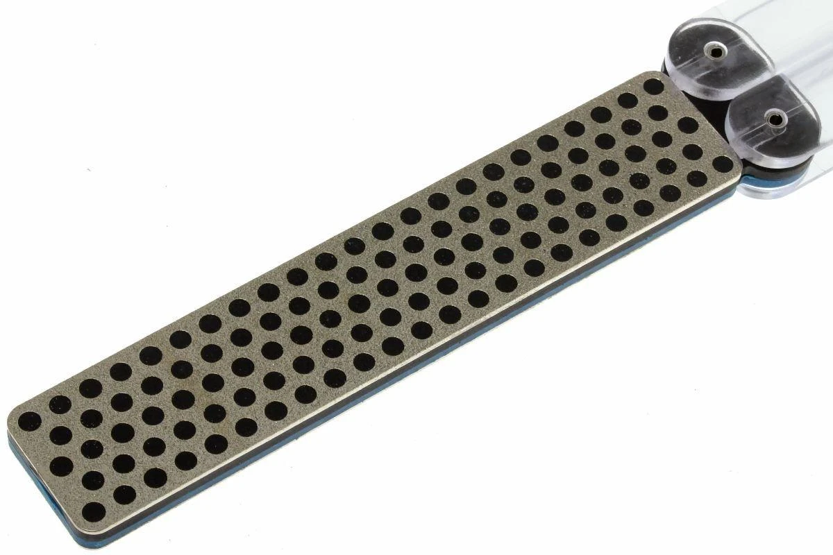 Una piedra de afilar Diafold tiene el diseño de un cuchillo de mariposa con el que el mango se dobla alrededor de la piedra de afilar de diamante. De este modo, las piedras están óptimamente protegidas. Las piedras pueden utilizarse por dos lados y cada lado tiene su propio tamaño de grano. El color en el conocido patrón de círculos de DMT muestra a qué tamaño de grano se refiere.