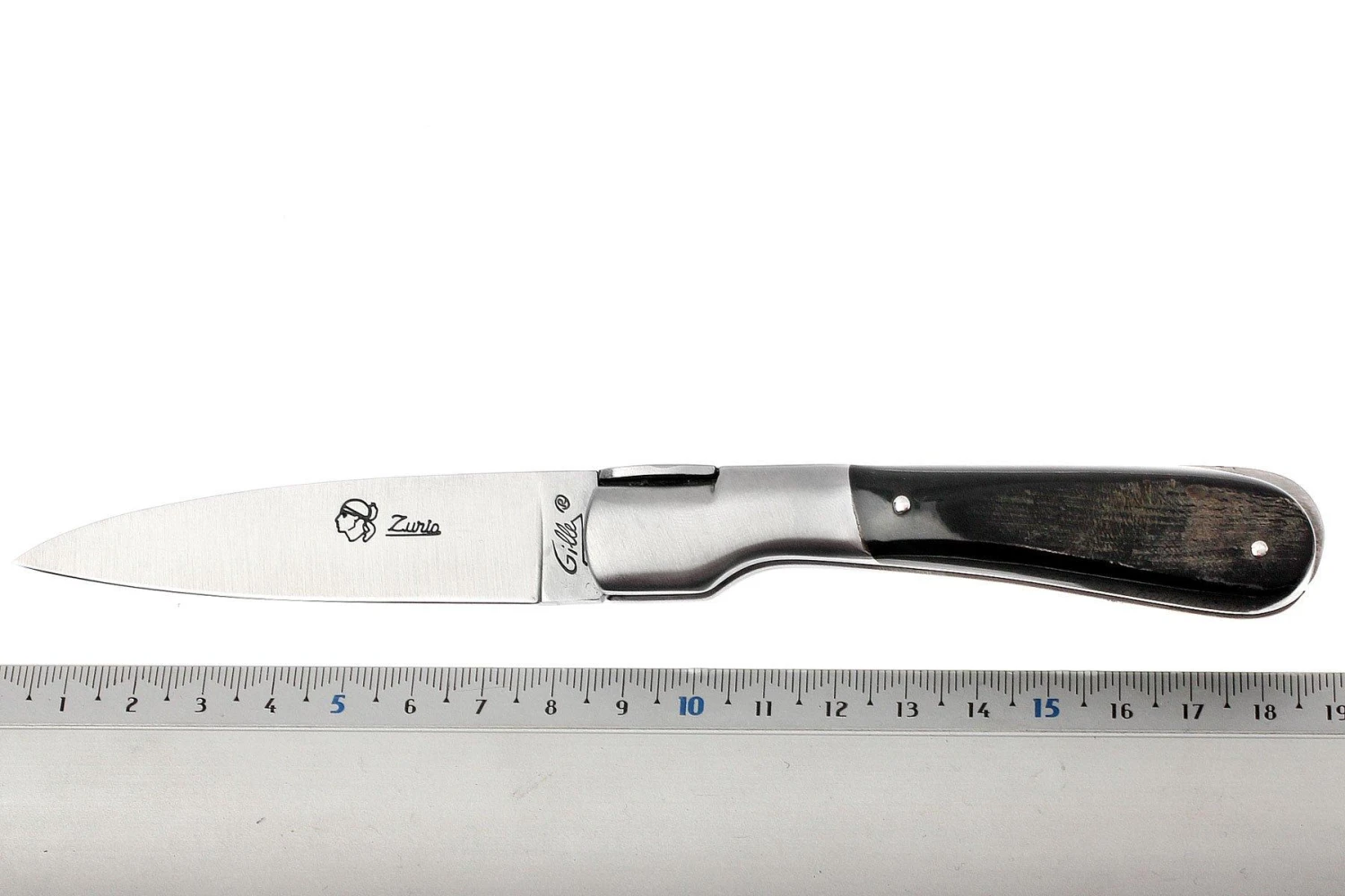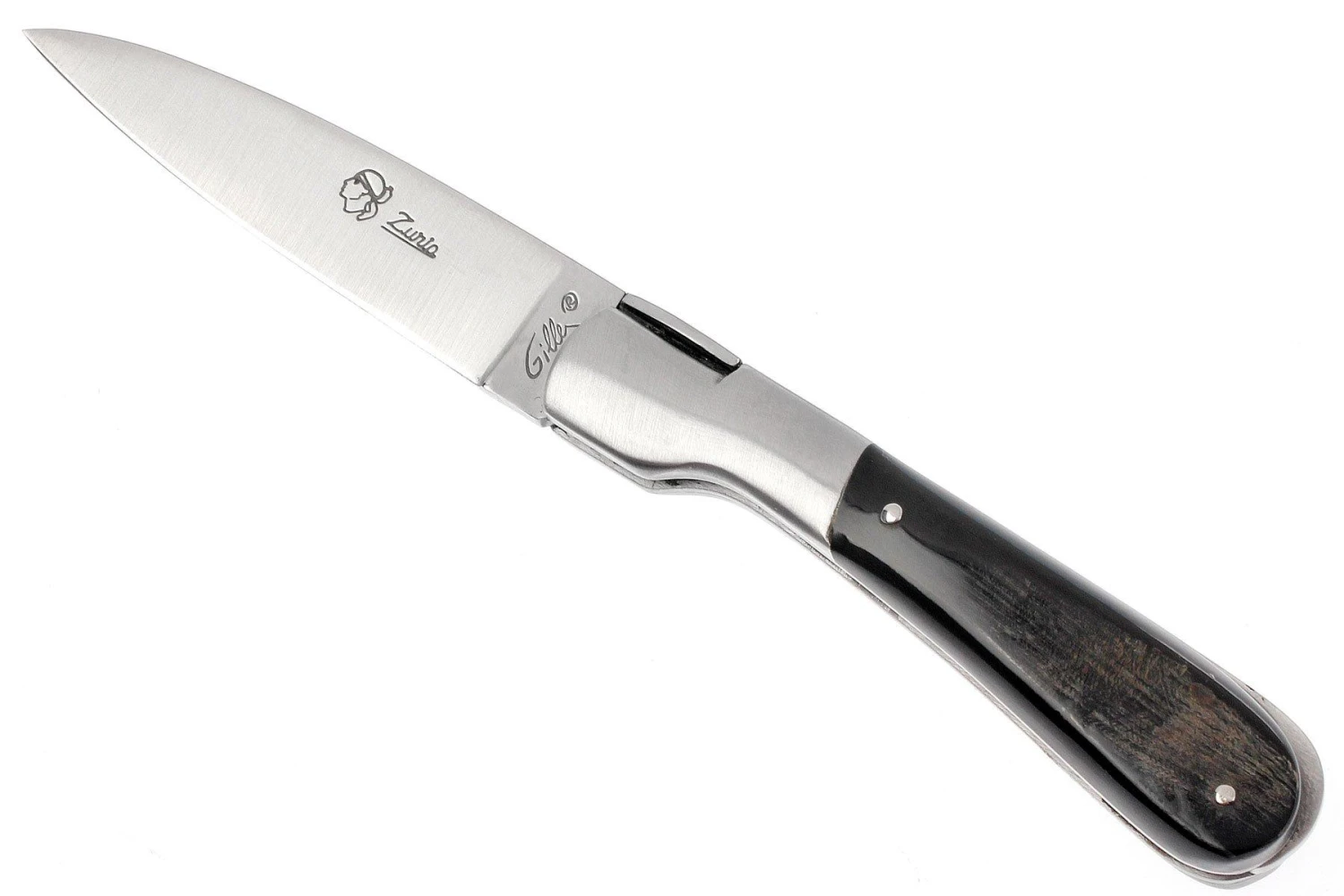 Clásica navaja francesa hecha a mano de Laguiole. Longitud cerrada: 10,5 cm. Cuenta con una hoja de acero 12c27 y un sistema de bloqueo backlock. El mango está hecho de corteza de cuerno de búfalo.