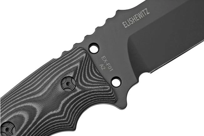El Hogue EX-F01 es un robusto cuchillo fijo. La hoja está hecha de acero para herramientas A2. Un tipo de acero que sólo es parcialmente resistente a la corrosión. Afortunadamente, el revestimiento KG 2400 GUN-KOTE protege el cuchillo de la oxidación. El filo, sin embargo, necesita un poco de atención de vez en cuando. Por suerte, esto se compensa con creces con la dureza de este tipo de acero. Por lo tanto, es un tipo de acero muy popular para los cuchillos de combate.