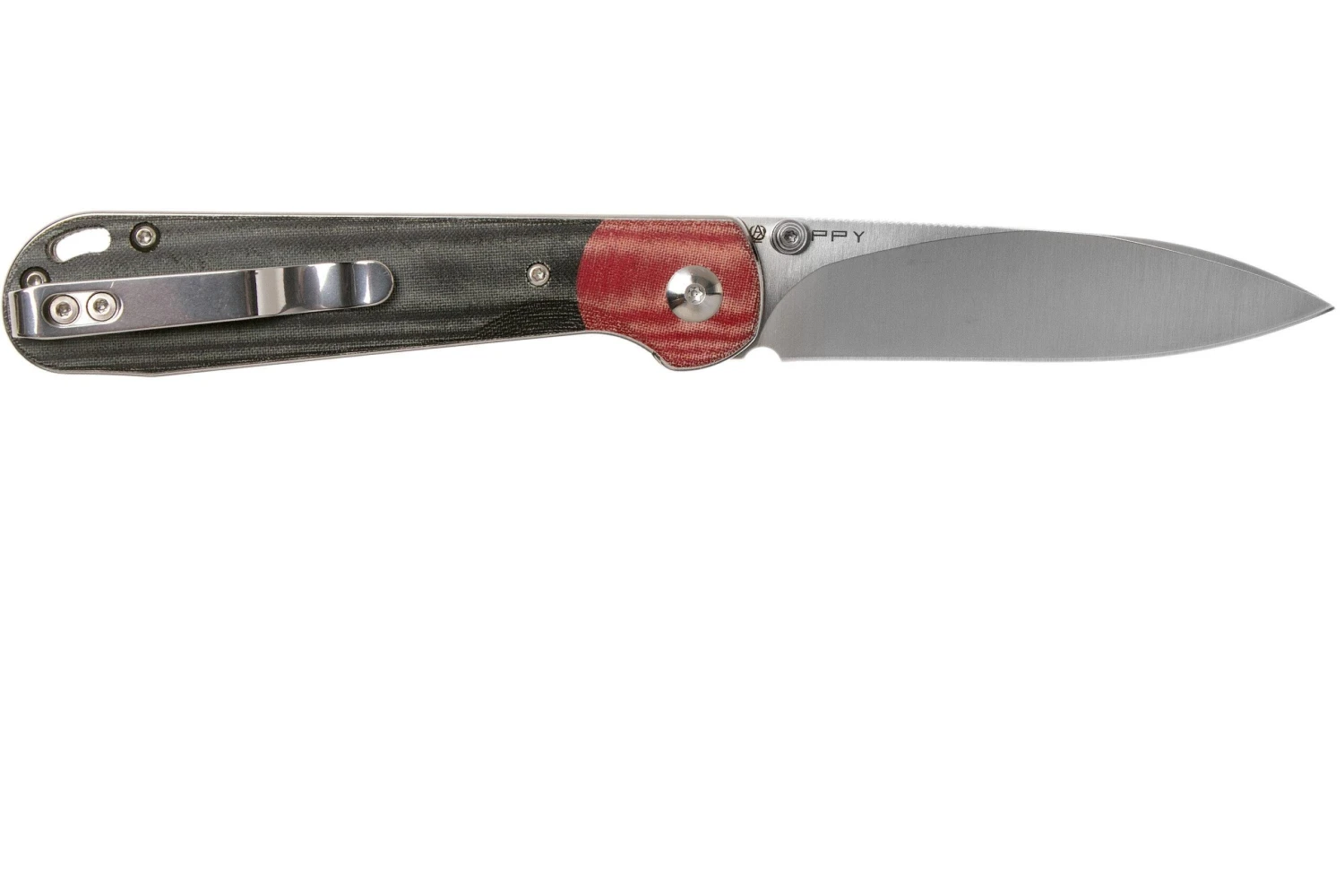 La Kizer PPY Rojo y Negro micarta es una navaja diseñada para el uso diario por Azo design. Con una longitud de hoja de 8 cm, el cuchillo es relativamente grande, pero sigue siendo ligero. Como tal, es una sólida navaja perfecta para el uso diario.