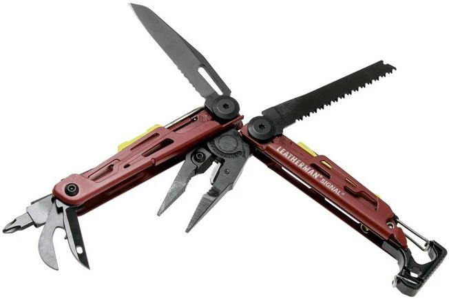 La Leatherman Signal Crimson es la multiherramienta ideal para los amantes de la supervivencia. Esta herramienta se distingue del resto con un par de herramientas específicas que resultan muy útiles al adentrarse en la naturaleza. Por ejemplo, está dotada de un silbato de emergencia, un yesquero, una piedra de afilar de diamante y muchas otras herramientas prácticas. Cuando está cerrada, el extremo romo de las herramientas funciona como martillo y mosquetón. También se puede utilizar para abrir una botella. Pero eso no es todo, tiene una pequeña pestaña para asegurar la herramienta cuando está cerrada. El clip de bolsillo estándar permite llevar la herramienta en el bolsillo incluso sin funda.