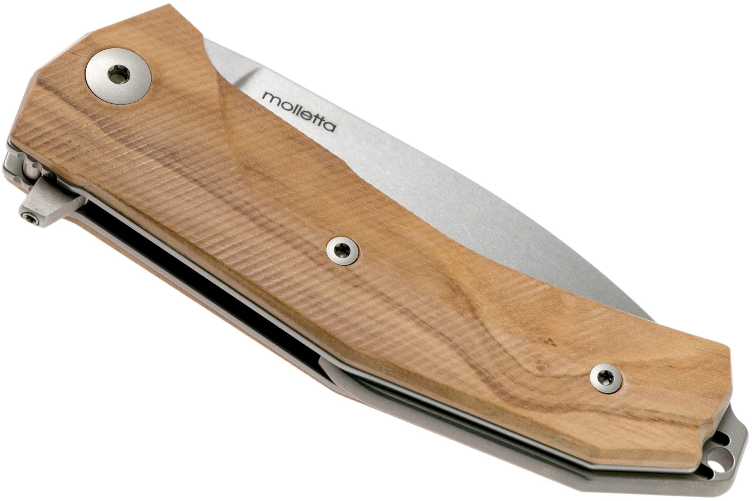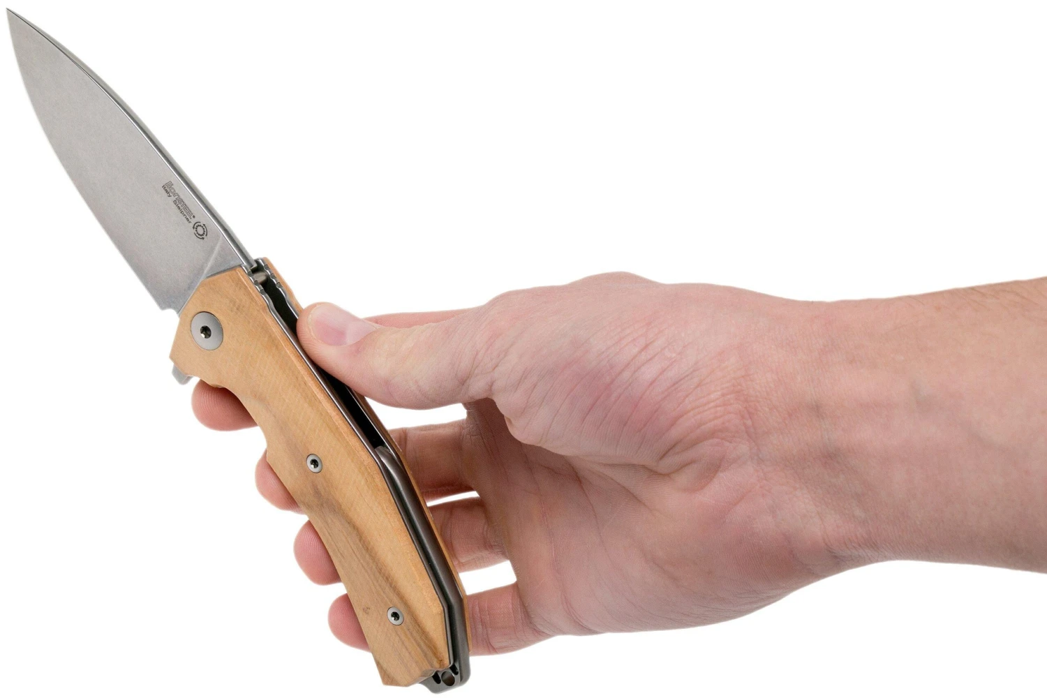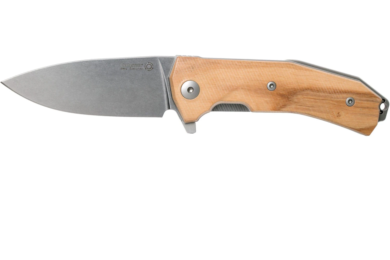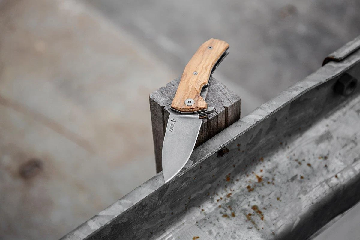 La LionSteel KUR es una impresionante navaja italiana, diseñada por Michele ‘moletta’ Pensato. Destacan las líneas hermosas de este diseño. Este típico ejemplo de diseño italiano no sólo tiene un aspecto increíble, sino que también se siente muy bien en la mano. El mango está hecho de una impresionante madera de olivo. Preciosa y huele muy bien. Para un mayor agarre, el mango está mejorado con un bonito patrón de agarre. La hoja está hecha de acero Sleipner de Austria. Se trata de un tipo de acero para herramientas conocido por su gran equilibrio entre la retención del filo y la resistencia. Sin embargo, ten cuidado con los ácidos, la humedad y la sal: el acero para herramientas no es completamente inoxidable. Así que límpialo y sécalo después de usarlo. La hoja se realza con el bonito acabado stonewashed. Por ello, las huellas de uso no destacan. Así que una opción perfecta para el uso diario.