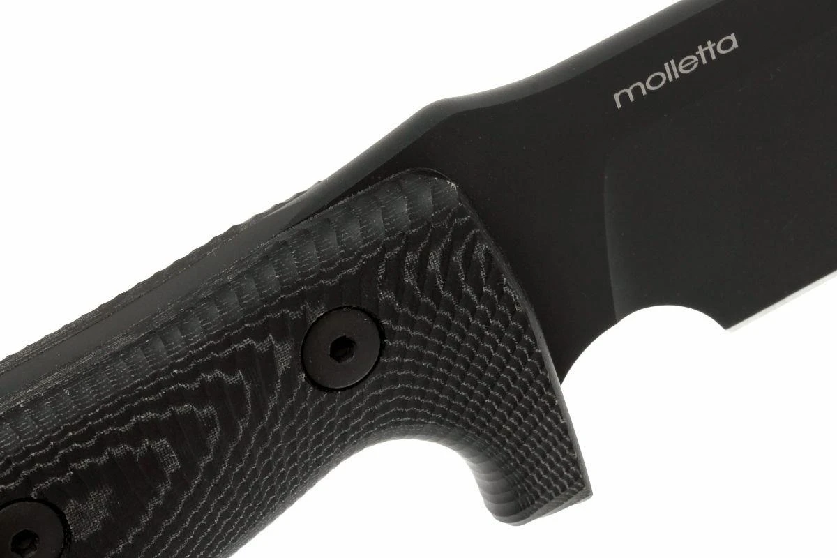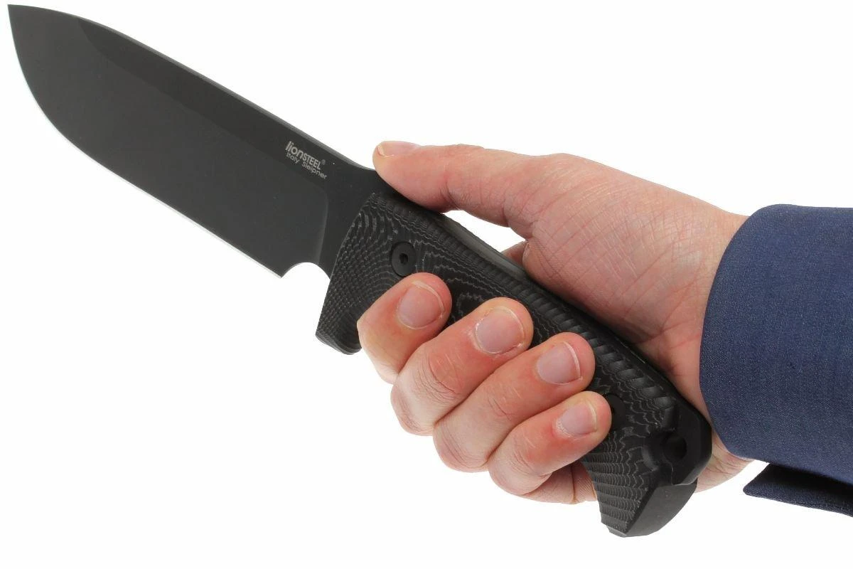 El M7 de LionSteel es una hoja fija polivalente para uso en exteriores. La primera versión fue un cuchillo de edición limitada que se realizó en colaboración con Moletta, o el fabricante de cuchillos Michel Pensato: el Carthago. Con algunos ajustes se ha convertido en el M7: un cuchillo con hoja de espiga completa y mango de micarta. El mango es más que suficiente para toda la mano. Sin embargo, en la hoja se creó un espacio para el dedo índice, para permitir un manejo más cuidadoso de la hoja. Un patrón mecanizado poco profundo en la micarta no sólo aumenta el agarre, sino que también realza el diseño especial que la hace inmediatamente reconocible como una hoja Lionsteel. La singularidad de este cuchillo es que el mango está mecanizado a partir de una sola pieza de mi carta. Normalmente, se montan dos piezas separadas de micarta en la hoja para crear un mango, pero el M7 está realmente colocado dentro de la micarta. Esta hoja es un tipo de hoja de trabajo pesado. La hoja de acero Sleipner tiene un grosor de 5,5 mm en el reverso. Combinado con la dureza de 60-61 HRC, este cuchillo resistirá en las condiciones más duras.