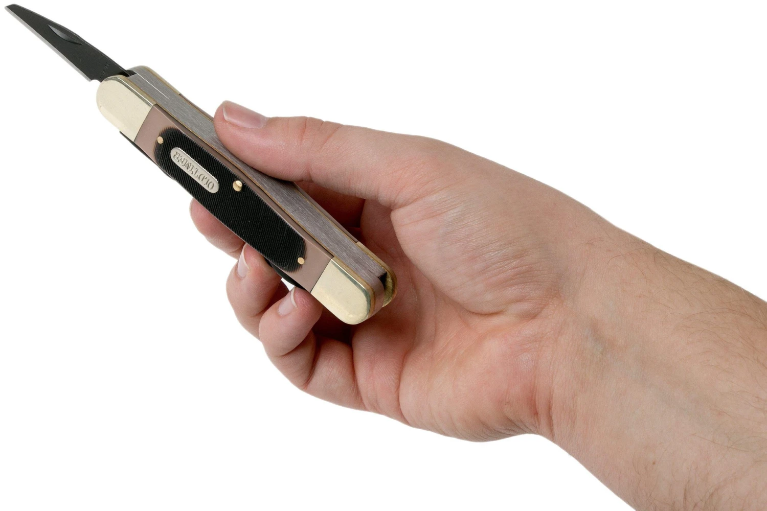 El cuchillo de tallado Old Timer 24OT es una navaja slipjoint económica con mango de polímero. Es una navaja especial para tallar madera con varias herramientas para tallar madera. Tiene gubias de cuatro tamaños, una hoja de cincel y una hoja normal. Es una navaja muy buena para cortar leña al lado de la hoguera. Debido a la forma de las gubias y a la posición en relación con el mango, esta navaja sólo es adecuada para usuarios diestros.