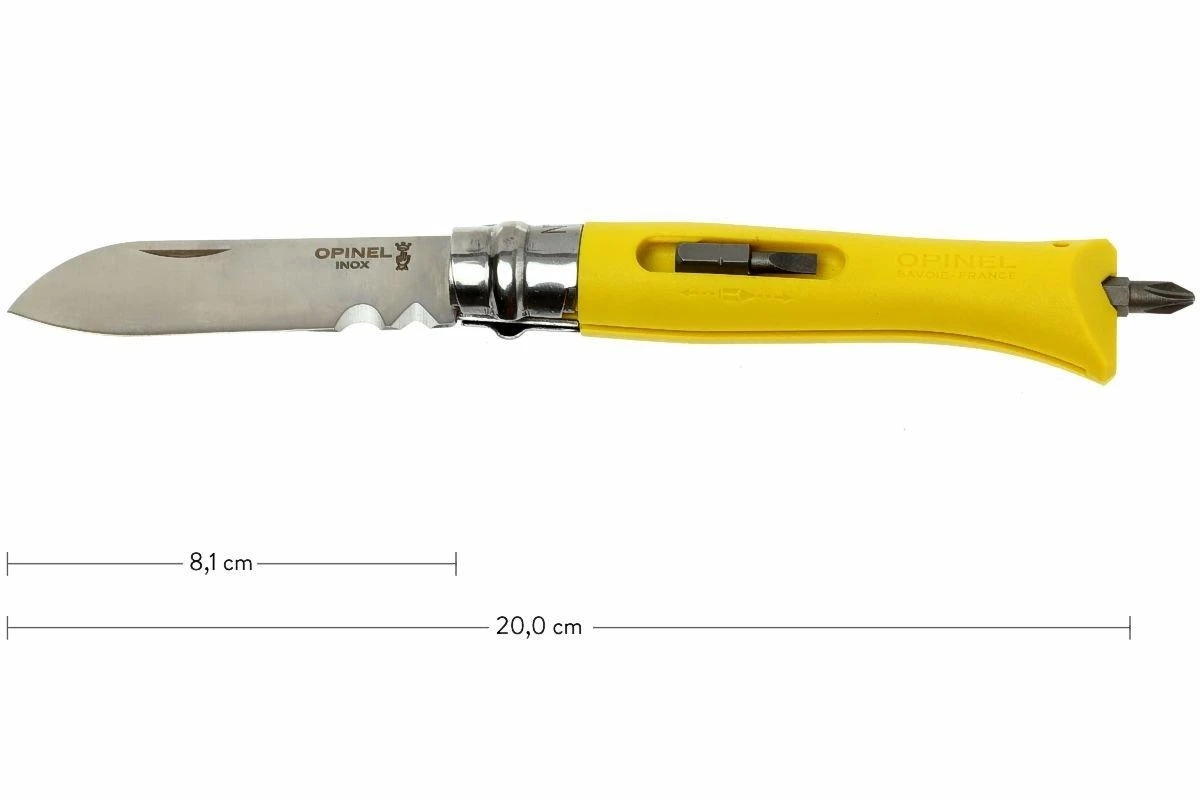 Para los fanáticos de Opinel que necesitan una multiherramienta, ahora tenemos una opción preciosa: el DIY Bricolage. Un modelo moderno y reconocible de Opinel que puede pasar por una multiherramienta. El mango es de plástico y el cuchillo cuenta con algunos extras útiles. En el mango hay dos puntas, un destornillador plano y un destornillador Philips. En la parte posterior del cuchillo hay un portapuntas magnético, en el que se pueden bloquear las puntas para su uso. La hoja presenta dos huecos que funcionan como pelacables y cortador.