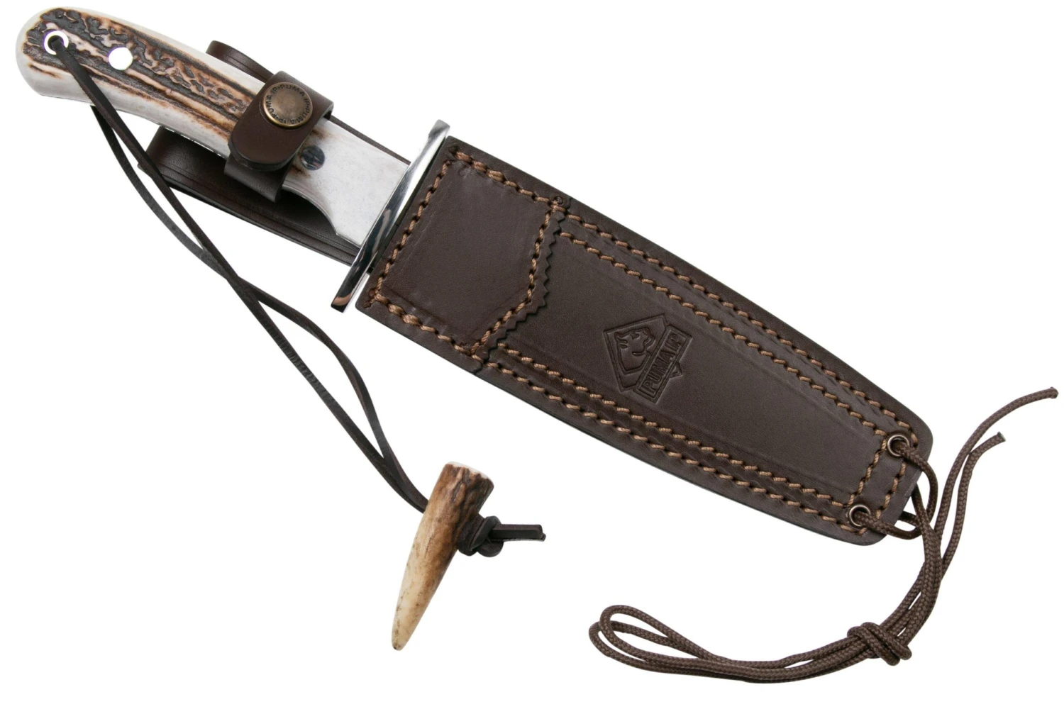 El PUMA IP El Anta es un cuchillo de caza clásico. Este cuchillo de caza está hecho a mano en España. El impresionante mango de cuerno tiene ranuras para los dedos, por lo que el cuchillo es cómodo de sostener. Las cachas se mantienen unidas por dos remaches tradicionales. La hoja y el mango están bien separados por un gran cabezal de acero inoxidable. Esto también funciona como un protector de dedos. La robusta hoja Bowie está hecha de acero inoxidable.