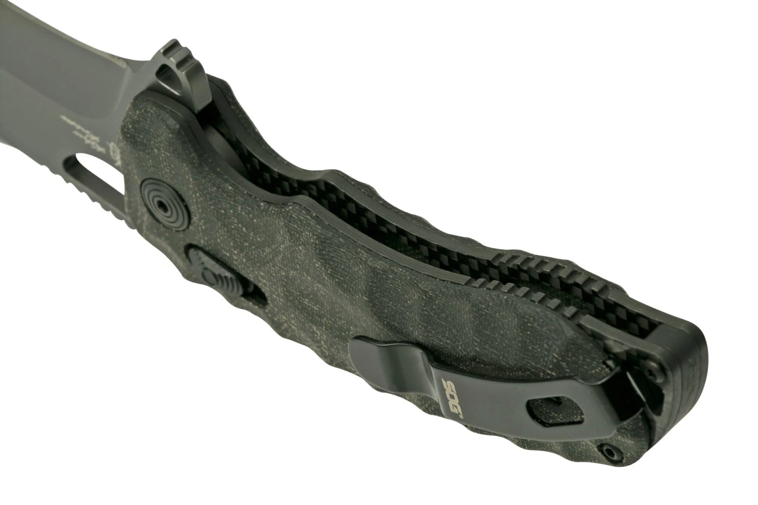 La SOG Kiku XR LTE es una genial navaja EDC, diseñada por Kiku Matsuda. Este fabricante de cuchillos japonés es conocido por sus extravagantes formas y afilados de hoja. Esta SOG Kiku también está mejorada con un afilado compuesto especial, combinado con una forma recurvada y una base tanto. Muy especial y típico de Kiku.