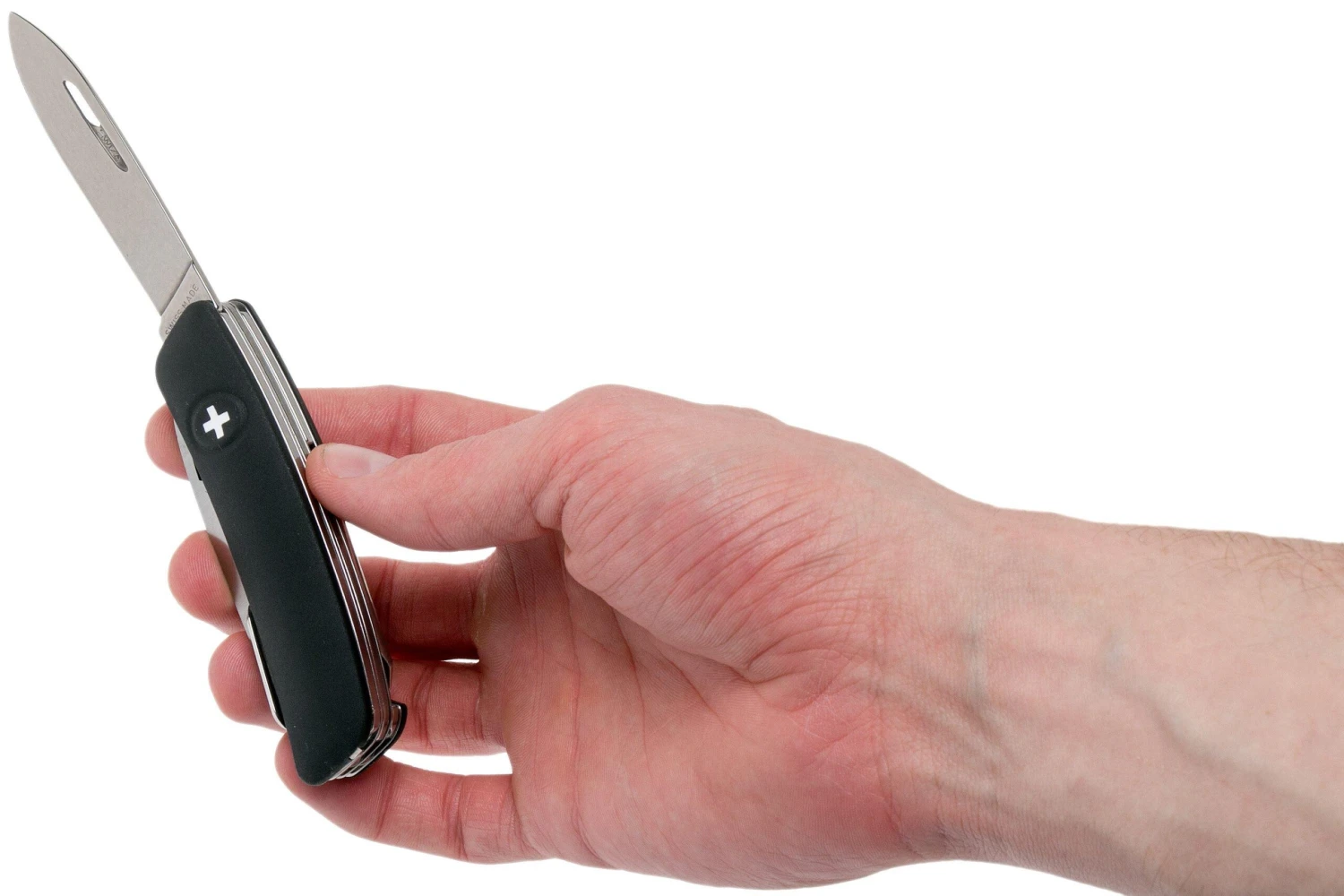 La Swiza D06 es una navaja contemporánea inspirada en las clásicas navajas suizas. Lo primero que se nota es el diseño moderno y ergonómico de los cuchillos. La innovación es evidente cuando se mira el bloqueo. El cuchillo se desbloquea presionando el logotipo en el mango. Swiza también tiene en cuenta a los usuarios zurdos recortando una pieza de la hoja que puede utilizarse desde ambos lados.